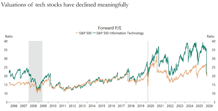 • As of April 11th, tech valuations have dropped from 40x to 20x, levels last seen before the AI boom began.