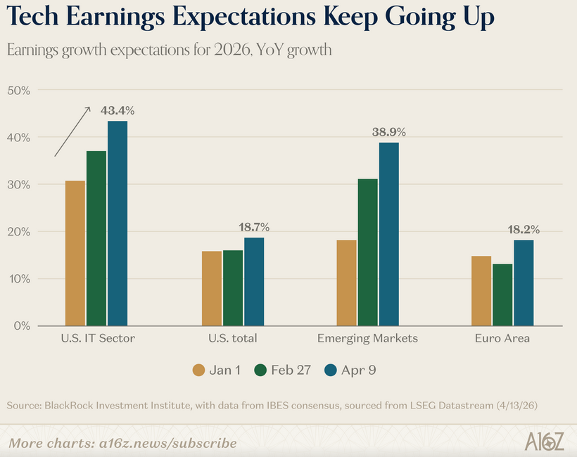 • The broader US market, by comparison, is sitting at mere 18.7%….it’s a very strange thing to have dramatically rising earnings expectations, while at the same time, dramatically falling premiums for those earnings.” — A16Z