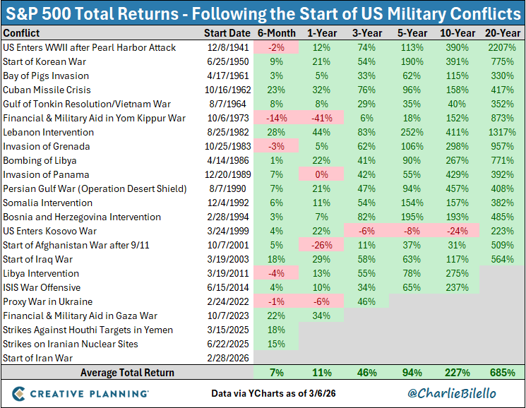 • 📱 US Stock Returns During Past Military Conflicts – “The best we can say looking at military conflicts in the past is that with the passage of time the stock market has tended to rise, and the more time that has passed, the more it has risen.