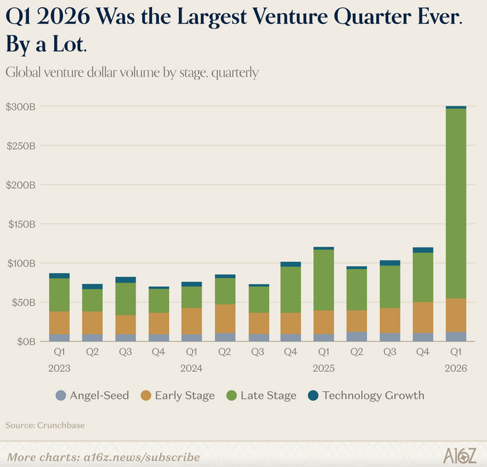 • 💰 Most Venture Capital Invested, Ever – “Q1 2026 was, by a wide margin, the largest quarter for venture investment ever recorded. Crunchbase data shows $300 billion poured into roughly 6,000 startups globally, up 150%+ both quarter over quarter and year over year.”