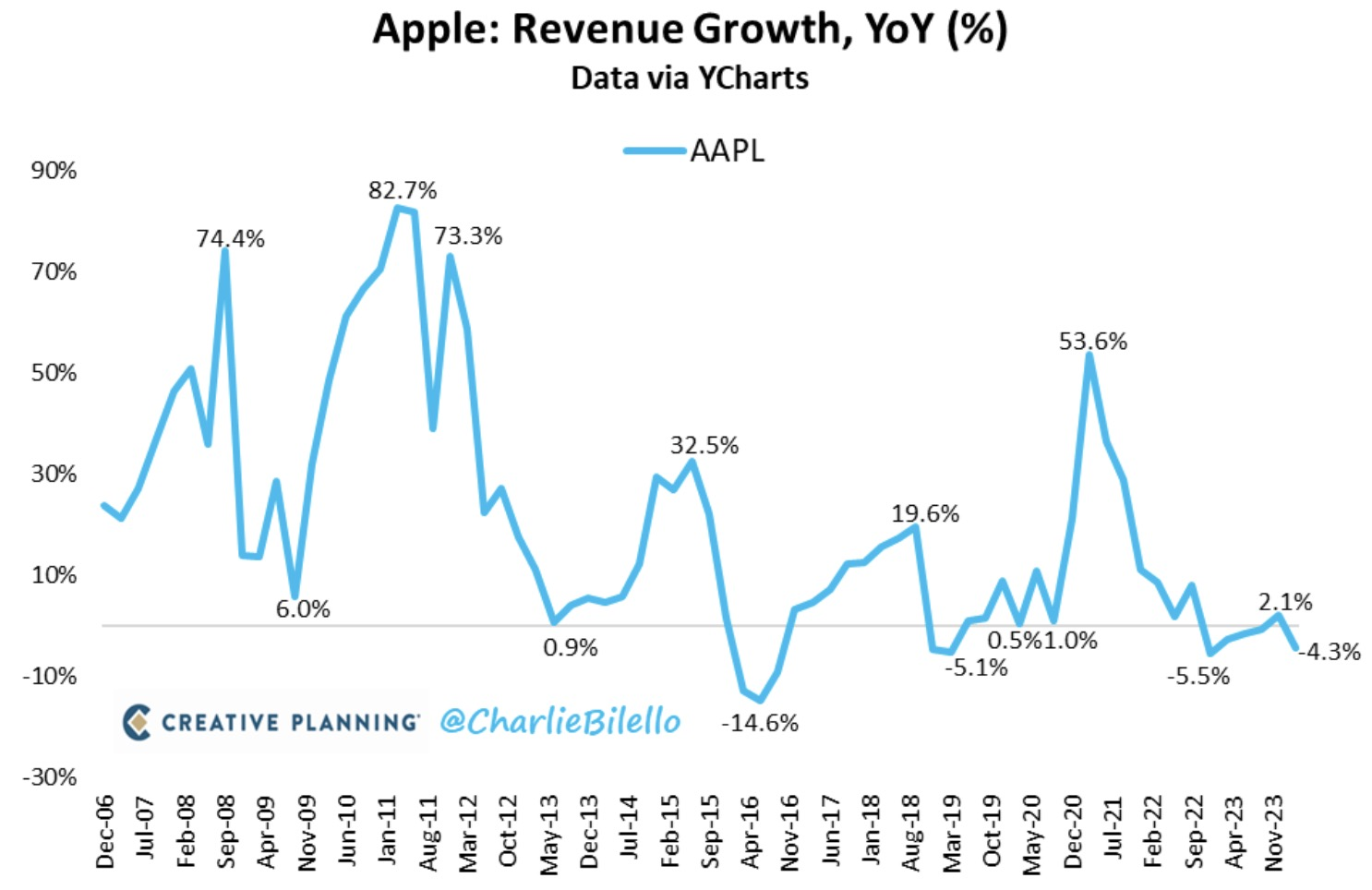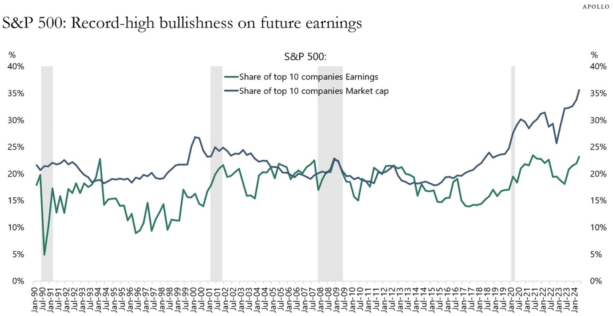 - High Expectations – “The top 10 companies in the S&P 500 make up 35% of the market cap but only 23% of earnings…the problem for the S&P 500 today is not only the high concentration but also the record-high bullishness on future earnings from a small group of companies.”