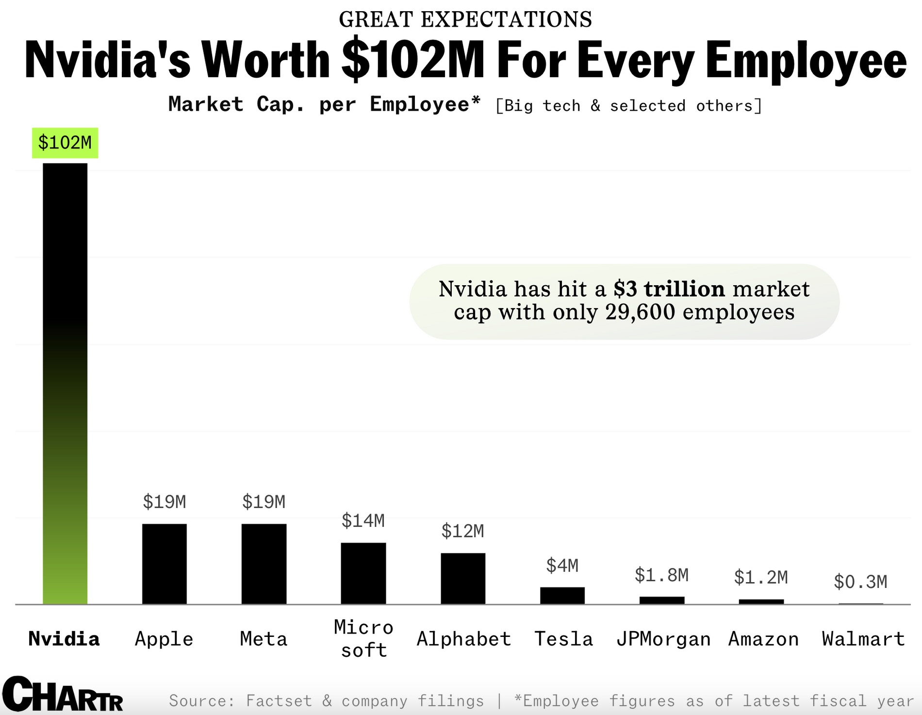 - Market Cap per Employee – Nvidia stands out in this wild chart. It looks at how much a company is worth (market capitalization) divided by how many people they employ: