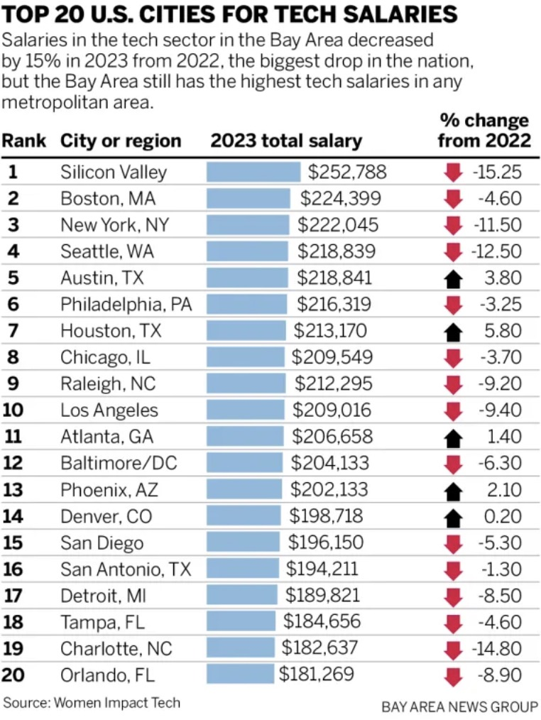 - Silicon Valley Salaries are Shrinking – Despite having the highest tech salaries in the country, Silicon Valley has experienced the biggest drop in pay compared to other tech hubs, falling 15% from 2022 to 2023
