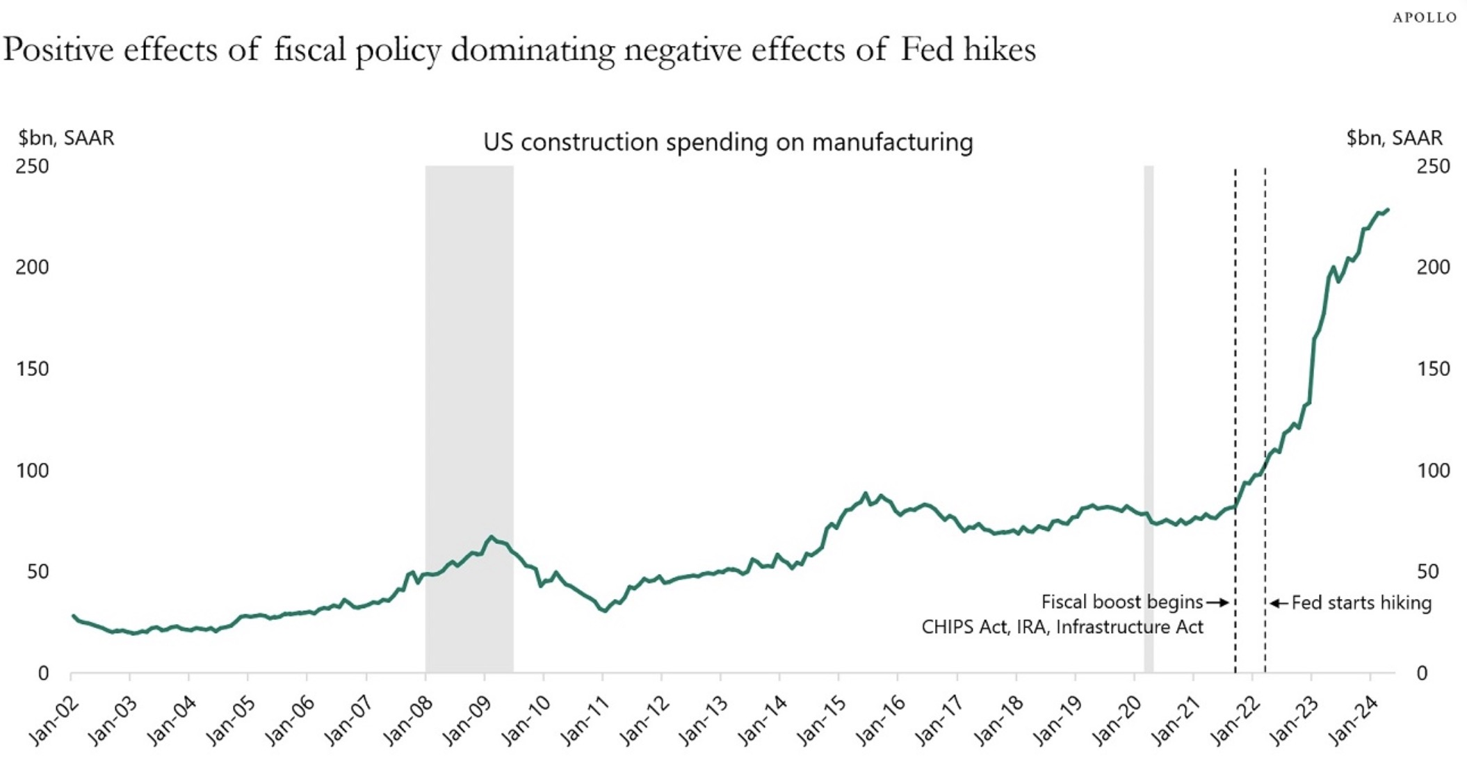 - Lots of Construction Spending – As a result of the CHIPS Act, the Inflation Reduction Act, and the Infrastructure Act, construction spending on manufacturing has skyrocketed: