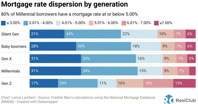 - Mortgage Rate Dispersion – 80% of millennials have a mortgage rate under 5%. Only 52% of Gen Z borrowers can say the same: