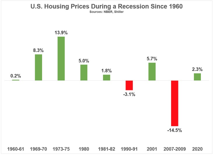 - Housing Prices During Recessions – Aside from 2007 – 2009, nationwide home prices have held up well during recessions: