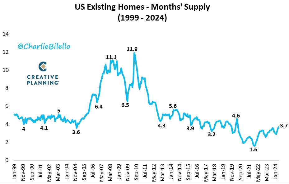 - “Months Supply” – This measure tracks how many months it would take to sell all the homes currently on the market if no new homes were listed for sale. Recently it has moved up, indicating that the supply of homes for sale is trending up: